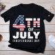 The phrase "Independence Day" is displayed beneath the main text in a clean, classic font, reinforcing the holiday's significance. The black background of the T-shirt makes the red, white, and blue colors pop, ensuring that the design stands out in any crowd.