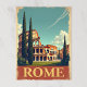 A distressed, vintage-inspired travel poster features the iconic Colosseum in Rome, framed by tall cypress trees under a clear blue sky with subtle clouds. "ROME" is prominently displayed at the bottom.