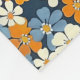 A vibrant floral pattern covers the entire image. Small, stylized flowers in shades of orange, light blue, and off-white are densely arranged on a navy blue background. The flowers have a slightly imperfect, painterly appearance, with variations in color saturation and shape that give the pattern a textured, almost hand-painted look. The repeated pattern creates a cheerful and busy visual effect.