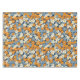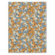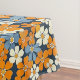 A vibrant floral pattern covers the entire image. Small, stylized flowers in shades of orange, light blue, and off-white are densely arranged on a navy blue background. The flowers have a slightly imperfect, painterly appearance, with variations in color saturation and shape that give the pattern a textured, almost hand-painted look. The repeated pattern creates a cheerful and busy visual effect.