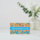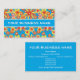 A pretty business card for many types of business, with an all-over pattern of red, orange, yellow flowers on a bright turquoise background, from a handpainted paper collage by Judy Adamson. Fully and easily customizable.