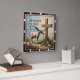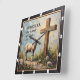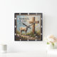 A unique wall clock presenting a textural, painted depiction of a innocent lamb gazing towards a cross, bathed in a soft light under a light blue sky. The powerful scripture, "BEHOLD, the Lamb of GOD... John 1:29," is artfully incorporated. This beautiful timepiece, with its rustic wooden border LOOK, serves as a poignant reminder of grace and salvation, making it a perfect, contemplative addition to any room.