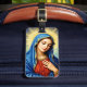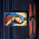 This beautiful and classic design features a portrait of the Virgin Mary with a serene expression and closed eyes, conveying a sense of deep reverence and peaceful meditation. She is dressed in a traditional blue veil and a red dress, with a radiant golden halo illuminating her head. The portrait is framed by an ornate, decorative border, giving it a timeless and spiritual quality. This design is versatile for a range of products with a religious or devotional theme. Imagine it on religious art prints, church goods, inspirational stationery, or spiritual home decor."