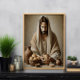 Jesus is seated at a plain table, wearing a flowing white robe and a modest head covering, radiating calm and compassion. His hands break a piece of bread, an act that signifies the Last Supper, a cornerstone of Christian theology symbolizing faith, sacrifice, and divine love.