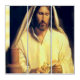A serene moment with Jesus dressed in a white robe with a head covering, performing the sacred act of breaking bread at a table indicative of the Last Supper, a significant event in Christian theology. Two clay vessels rest beside Him, with one appearing to be a wine jug, while a woven basket filled with loaves symbolizes abundance. The gentle expression on His face reflects a deep spiritual solemnity.He is depicted with a serene expression, holding a piece of bread with elements of a simple meal laid out on the table, including a clay jug and a woven basket.