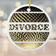 This product is a ornament for a successful end of a divorce process. It is a nice gift from family, friends and colleagues to celebrate the end of a marriage or decoration for divorce parties. The elegant design features a golden disco ball with the word divorce on a teal grey background.