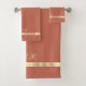 Personalize this Bath Towel Set with your monogram in fancy gold script and name on brushed gold stripes on copper background.