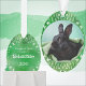 Name on one side with the words "Christmas Time with". Your bunny's photo appears in a Green ring with white Christmas designs drawn in white chalk.