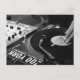 A classic image of a DJ spinning vinyl, in black-and-white. Showing DJ's hand, vinyl, turntable and DJ mixer.
