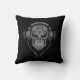 This elaborate DJ sugar skull design is decorated with intricate swirls and dot patterns. Headphones sit on top of the skull with two wires hanging below. The complex lines and circles are painted black while the interior is a deep, highlighted grey color. The sugar skull sits on a pure black background which creates a subtle contrast. Music blasts out of the headphones in the form of aggressive grey lightning bolts. This stylish Day of the Dead inspired image makes a striking pillow design.