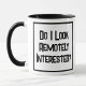 Funny slogan on a Two Tone mug that says "Do I LOOK remotely Interested". Indicate to people how much you care about whatever they're on about. Black and white bold text.
