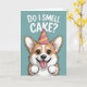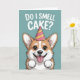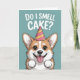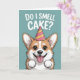 A cute and funny birthday card featuring an adorable cartoon corgi wearing a party hat and smiling with excitement under the phrase “Do I smell cake?”. Perfect for dog lovers, friends, and anyone who enjoys playful birthday humor.