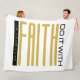 This fleece blanket features a fatimi/lastica/telegraf print font with gold and black letters with a vertical/horizontial typograph style displaying the phrase "Do It With Faith In Your Lord" in this biblical quote theme. This Blanket is made from 100% buttery soft and cozy polyester fleece with edge-to-edge vibrant full color sublimation printing and double edge stitching with a off-white colored back machine washable.