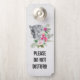 A door hanger which says: Do Not Disturb (text can be changed / personalized) with a beautiful illustration featuring a gray, black and white leopard portrait. This lovely animal is surrounded by a tropical flower bouquet. Elegant, exotic and lovely.