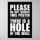 Cover up an ugly wall or escape tunnel with this poster. White text on black background: "Please do not remove this poster. There is a hole in the wall."
