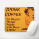 Smiling woman with retro red lipstick and nails drinks her cup of morning coffee. The caption reads "Drink Coffee - Do Stupid Things Faster with More Energy."