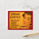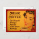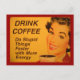 Smiling woman with retro red lipstick and nails drinks her cup of morning coffee. The caption reads "Drink Coffee - Do Stupid Things Faster with More Energy."