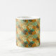 This mug has a mid-century modern design of a record adapter overlapping all over in tan, off-white, brown, orange, turquoise, blue, and green.