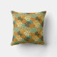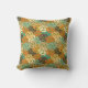 This throw pillow has a mid-century modern design of a record adapter overlapping all over in tan, off-white, brown, orange, turquoise, blue, and green.