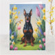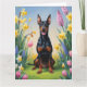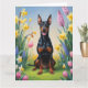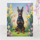 A cheerful dog sits peacefully on lush green grass, surrounded by colorful spring blooms under a soft blue sky. This digital oil painting captures a serene moment with expressive brushstrokes, warm colors, and a sense of gentle joy.