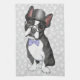 Frenchie dog with hat, lavender bow tie, and glasses The background is paws print