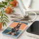 This keychain features a portrait of a beautiful Doberman Pinscher Dog. The image is placed on a retro, slightly distressed coral and blue sunset background. The image is framed in matching blue. The back has the same blue background with your text in two fields.