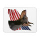 An elegant red/brown Doberman Pinscher headstudy in front of a waving American flag.