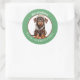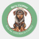 An image of an adorable black and tan Doberman Pinscher puppy dog wearing a winter hat is at the center of this Holiday sticker. The image is framed in a circular green border which contains your custom text in white. Cute for Christmas cards, correspondence, and gift packages.