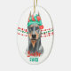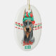 A beautiful Doberman Pinscher dog wears a red and green Santa Claus hat in front of strings of red and green Christmas beads on both sides of this ornament. At the bottom are two text fields in matching red and green for your own text. The back has the same image with a third text field in red. Perfect for anyone who is owned by a Dobie!