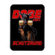 A black Dobermann Pinscher retrieving a schutzhund dumbbell on a flexible photo magnet.