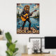 This compelling artwork portrays a lion, looking effortlessly cool in sunglasses and a leather jacket, masterfully "shredding" an electric guitar on a wooden dock. The dock juts into a tranquil blue lake, bordered by evergreen trees under a soft sky. The painting's thick, expressive impasto creates a tangible texture, making the "Rock or Die" declaration resonate with the raw emotion of the scene.