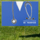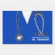 Creative medical school graduation congrats sign featuring hospital scrubs and stethoscope. To personalize for doctor grad edit text to add his or her name.