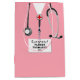Doctor graduation gift bag featuring pink hospital scrubs and stethoscope art. Edit text to add doctor, physician assistant or nurse grad's name.