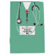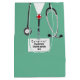 Doctor graduation gif bag featuring hospital scrubs and stethoscope art. To personalize edit text to add doctor, physician assistant, or nurse's name.