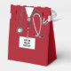Creative medical doctor party favor boxes featuring red hospital scrubs and a stethoscope. Edit text to easily personalize.