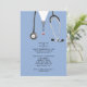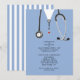 Creative medical school graduation party invites featuring blue hospital scrubs and stethoscope. Edit text to create unique doctor party invitation or medical school grad announcement.