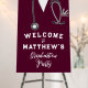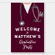 Creative medical school graduation party welcome sign for doctor graduate featuring unique maroon hospital scrubs and funny Swiss army knife. Edit text to add name or otherwise customize.