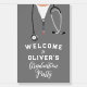 Creative medical school graduation party welcome sign for doctor graduate featuring gray hospital scrubs and stethoscope. To personalize edit text to add name or otherwise customize.
