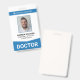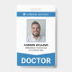A modern ID badge for hospitals, clinics and medical facilities. The medical staff ID badge template includes an ID photo of your employee, the employees name and profession, as well as a badge ID number. The group name set as "doctor" is prominently displayed at the bottom with an arrow like design pointing it out. The back of the hospital staff ID badge is intentionally left blank and open for you to add further information about the employee and your hospital or clinic...