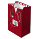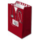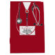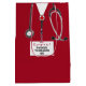 Creative doctor graduation gift bag featuring red hospital scrubs and stethoscope art. Edit text to add doctor, physician assistant, or nurse's name.