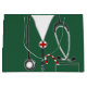 Creative medical themed Christmas holiday gift bag featuring green hospital scrubs, a stethoscope and a candy cane.