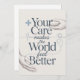 Express sincere gratitude to doctors and healthcare professionals with this refined thank-you card featuring the message “Your Care Makes the World Feel Better.” Clean design and calming colors make it perfect for medical appreciation or hospital staff gifts.