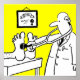 A doctor is using his stethoscope on a patient's feet. Funny medical poster has a cartoon doctor testing a patient. Medical humour in a funny poster.