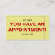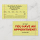 An easy to fill out appointment reminder card for your doctor’s or dentist’s office. Circle the day of the week and then fill in the date and time and circle AM or PM. Small text, “This time is reserved exclusively for you. If unable to keep this appointment please give 24 hours notice, otherwise you will be billed personally for the time reserved.” Huge red text on the back, “YOU HAVE AN APPOINTMENT!” All text can be changed and personalized for your business.