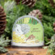 A snow globe with a beautiful forest scene including doe and fawn drinking from a stream near a waterfall. Original artwork by W.B.