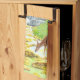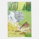 A kitchen towel with a beautiful forest scene including doe and fawn drinking from a stream near a waterfall. Original artwork by W.B.