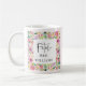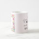 This mug has a different front and back. One side reads "Does this ring make me look engaged?" A cute blush design with modern luxury calligraphy design featuring a gold diamond engagement ring on a blush pink background. The other side features a pretty floral frame surrounding the quote "Future Mrs" and your married name. A cute gift for the soon to be bride.