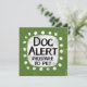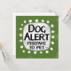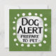 An irreverent and cute typographic animal design that says "Dog Alert, Prepare To Pet". It features black and red text on a white rectangle with funky, playful white dots surrounding it, all on a gray background.