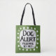An irreverent and cute typographic animal design that says "Dog Alert, Prepare To Pet". It features black and red text on a white rectangle with funky, playful white dots surrounding it, all on a gray background.