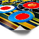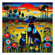 A.I. assisted print of a vibrant scene depicts a stylized dog and cat seated together among a surreal landscape and exaggerated floral designs, whimsical, colorful plants, beneath a striking sunset with bold colors and geometric patterns.